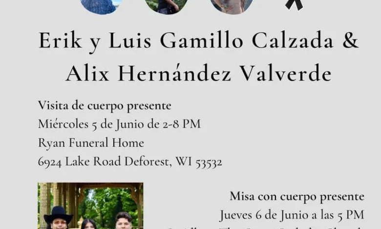 Luis y Erik Gamillo y Alix Hernández serán velados el miércoles, en el Ryan Funeral Home (https://www.ryanfh.com/) , ubicado en 6924 Lake Road Deforest de 2:00 – 8:00 pm. La misa con cuerpo presente será el jueves seis de junio a las 5:00 pm, en St Albert The Great Catholic Church, ubicada en 2420 St Albert the Great Drive, Sun Praire, WI 53590.
