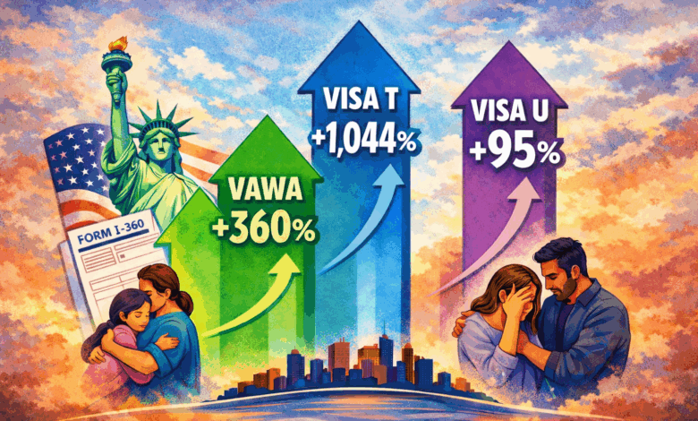 De acuerdo con USCIS, entre los años fiscales 2020 y 2024, las autopeticiones VAWA (Formulario I-360) aumentaron aproximadamente un 360%. En ese mismo período, las solicitudes de estatus de no inmigrante T —para víctimas de trata de personas— se incrementaron en un 1,044%, mientras que las peticiones de visa U —para víctimas de ciertos delitos— crecieron cerca de un 95%.