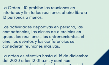 En el Condado Dane, se prohíbe reuniones en interiores y se limita reuniones al aire libre a 10 personas