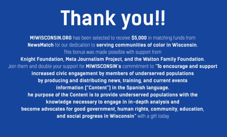 MIWISCONSIN.ORG ha sido seleccionado para recibir $ 5,000 en fondos de contrapartidos de NewsMatch por nuestra dedicación a servir a las comunidades de color en Wisconsin. Esta donación fue posible gracias al apoyo de Knight Foundation, Meta Journalism Project y Walton Family Foundation. Únase a ellos y duplique su apoyo al compromiso de MIWISCONSIN de “Fomentar y apoyar un mayor compromiso cívico de los miembros de las poblaciones desatendidas mediante la producción y distribución de noticias, capacitación e información de eventos actuales (” Contenido “) en español. El propósito del Contenido es proporcionar a las poblaciones desatendidas el conocimiento necesario para participar en un análisis profundo y convertirse en defensores del buen gobierno, los derechos humanos, la comunidad, la educación y el progreso social en Wisconsin ”con un obsequio hoy.