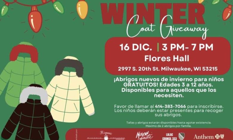 Winter Coat Giveaway, se realizará el próximo 16 de diciembre, de 3:00pm-7:00pm en Flores Hall (2997 S. 20th St. Milwaukee, WI 53215). Recuerde llamar al 414-383-7066 para registrarse.