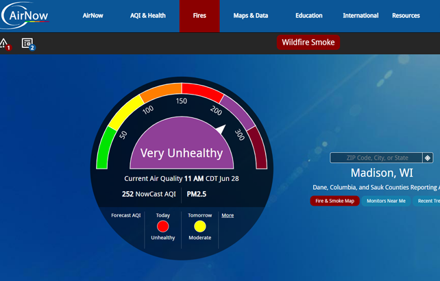 El Departamento de Salud y el Condado Dane estan pidiendo a la comunidad que se proteja así mismo de humo no saludable con una alerta hasta la tarde del jueves 29 de junio.