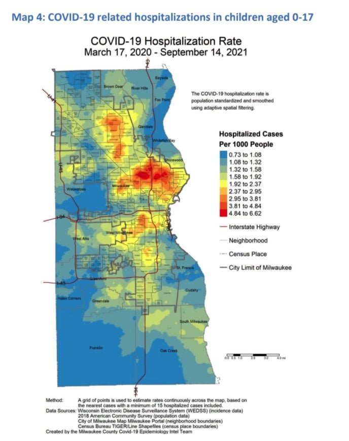 De los 380 hospitalizados por COVID-19 en edades menores de 18 años en el condado de Milwaukee, 50% eran de raza/etnia afroamericana, 15.5% blancos, 25% hispanos, asiáticos son un 5.5% y raza desconocida un 2.6%.
