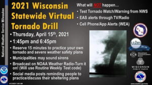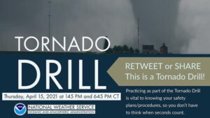Este 15 de abril desde la 1:45pm y hasta 6:45pm se estaran realizando una serie de simulacros de alerta de tornado en todo el estado. El simulacro incluyen señales de emergencia en radio y televisión en diferentes tonos. Se recomienda tomar 15 minutos para revisar sus planes de seguridad y prácticas en caso de clima inclemente.